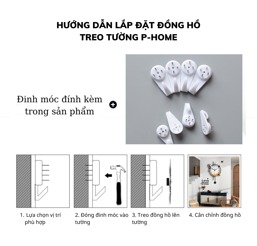 Việc lắp đặt đồng hồ trở nên đơn giản hơn bao giờ hết với thiết kế tiện lợi từ P-HOME. Không cần khoan đục tường, bạn có thể treo đồng hồ một cách nhanh chóng và an toàn, giữ cho tường nhà luôn gọn gàng và không bị hư hại.