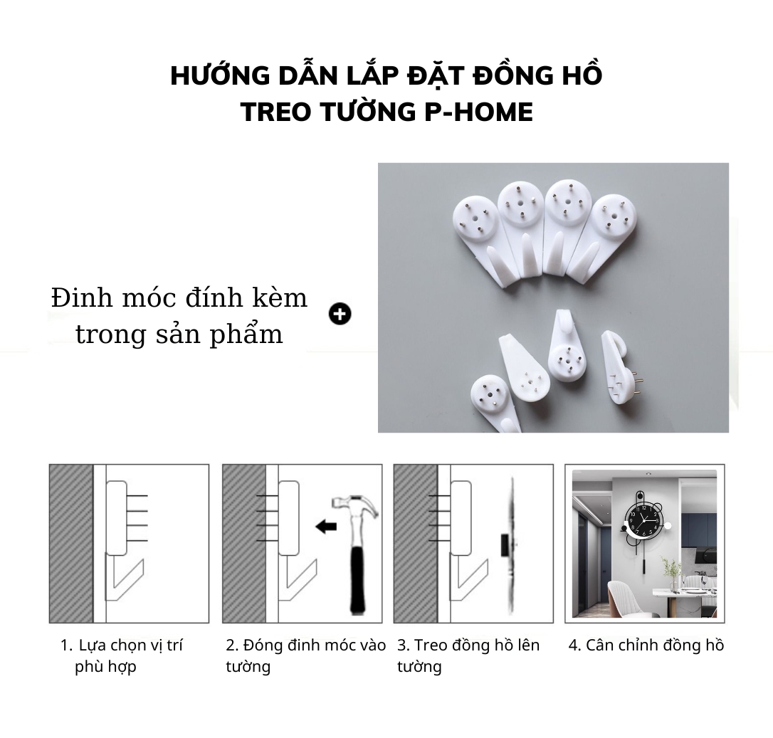 Một điểm cộng lớn của đồng hồ treo tường từ P-HOME là dễ dàng lắp đặt mà không cần khoan đục tường. Việc này giúp bạn tiết kiệm thời gian và bảo vệ tường nhà luôn nguyên vẹn và đẹp mắt.