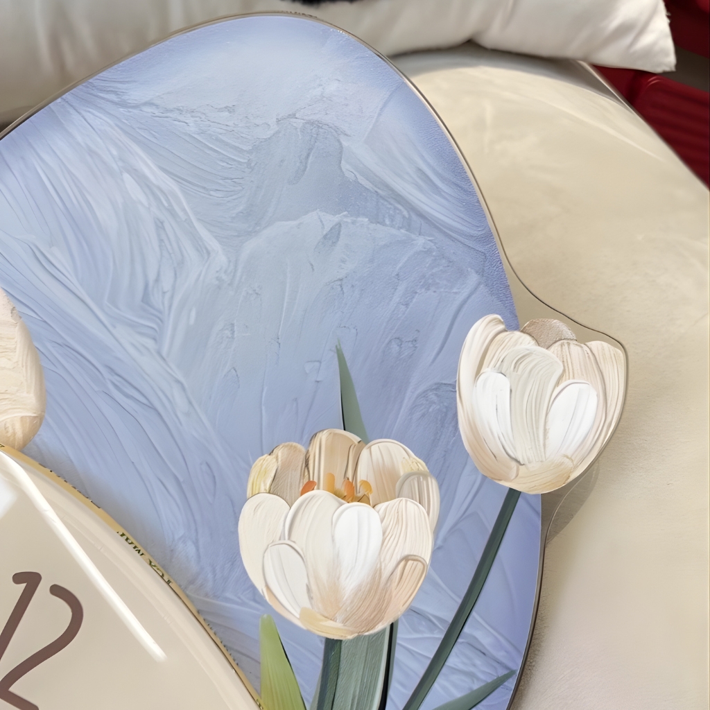Đồng hồ CL103 mang phong cách Hiện đại (Modern) kết hợp Scandi-Boho, với thiết kế hình dạng phi đối xứng độc đáo, mô phỏng sự kết hợp ngẫu hứng nhưng hài hòa của các mảng màu và hình khối tự nhiên. Họa tiết hoa Tulip/hoa Uất Kim Hương màu vàng kem mềm mại trên nền màu xanh da trời nhạt (hoặc màu đá cuội) tạo cảm giác thư thái, nhẹ nhàng, lý tưởng cho mọi không gian từ phòng khách, phòng ăn đến phòng ngủ.