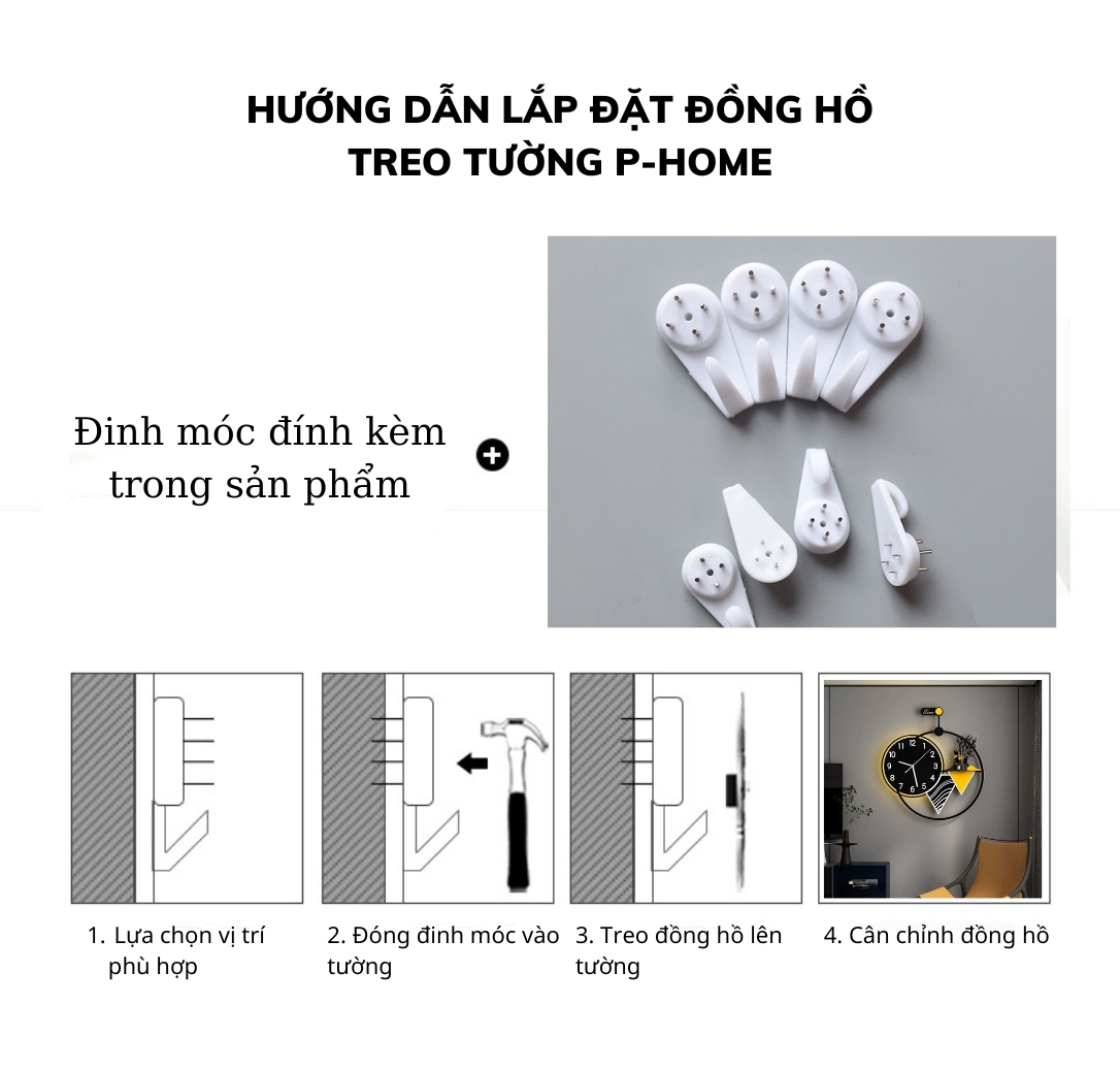 Việc lắp đặt đồng hồ treo tường P-HOME không cần khoan đục tường, giúp bạn tiết kiệm thời gian và giữ cho tường nhà luôn sạch sẽ. Thiết kế tiện dụng này phù hợp với mọi người, từ các gia đình trẻ đến người lớn tuổi.