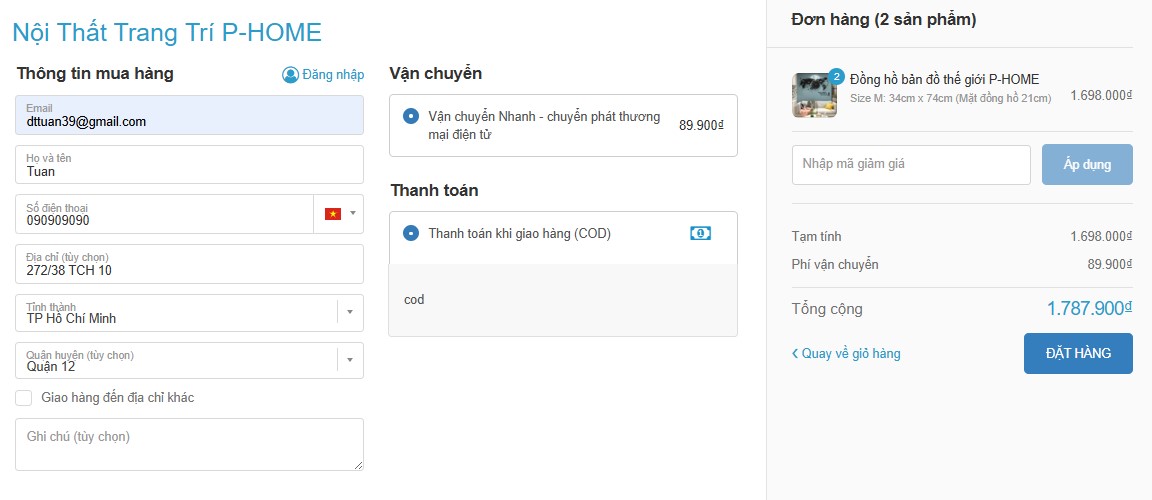 Bước 4: Điền các thông tin của bạn để nhận đơn hàng, lựa chọn hình thức thanh toán và vận chuyển cho đơn hàng của mình