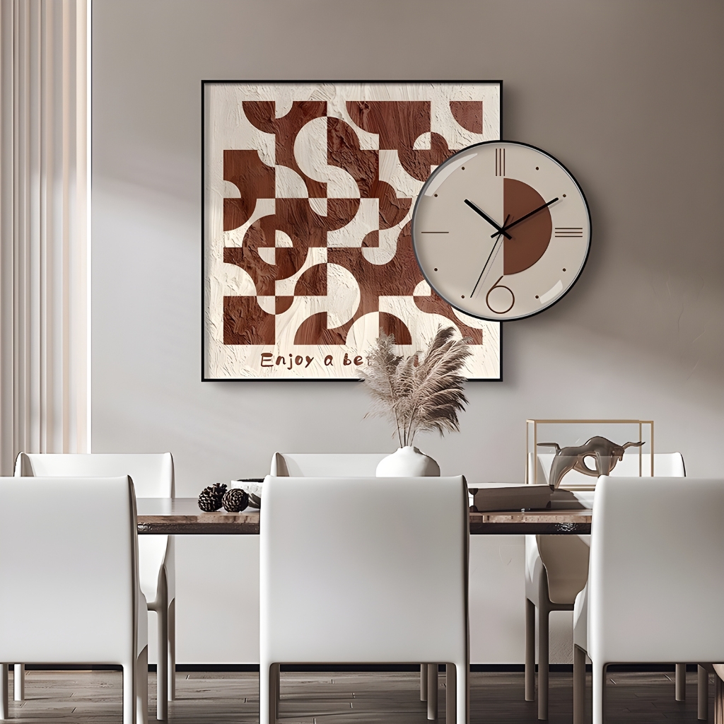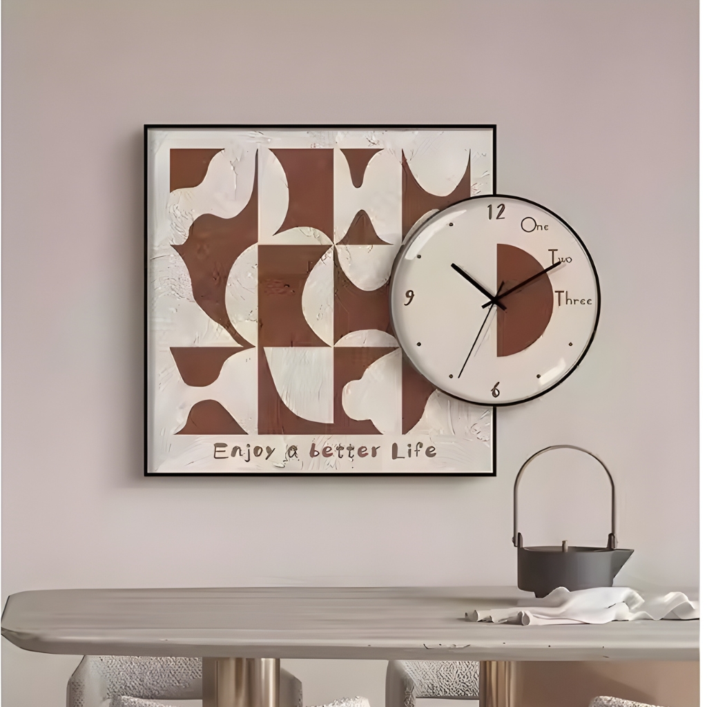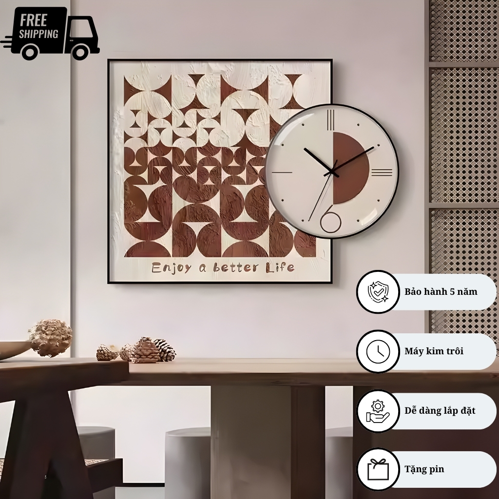 Dựa theo hình ảnh thực tế, sản phẩm sở hữu bức tranh trừu tượng tông nâu – trắng nổi bật, đi kèm đồng hồ mặt tròn tối giản đặt cạnh, tạo nên tổng thể mang tính nghệ thuật cao. Dòng chữ “Enjoy a better life” được in nhẹ nhàng bên dưới tranh, tạo cảm giác ấm áp và truyền cảm hứng cho không gian sống.