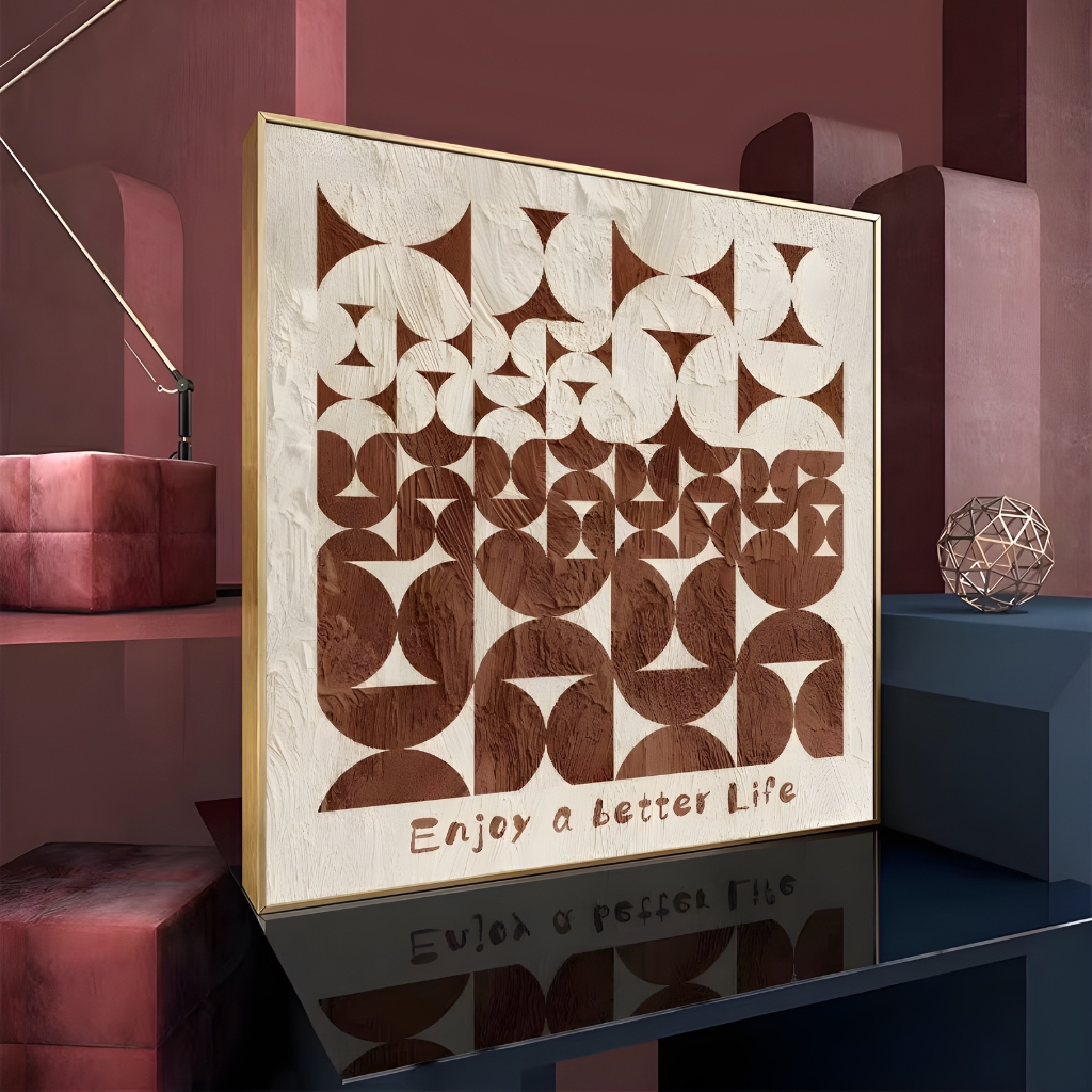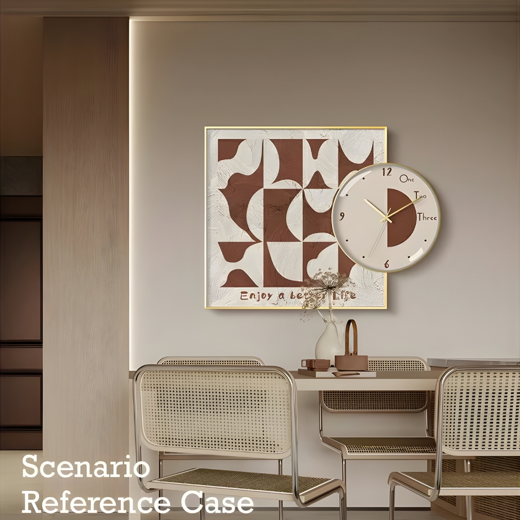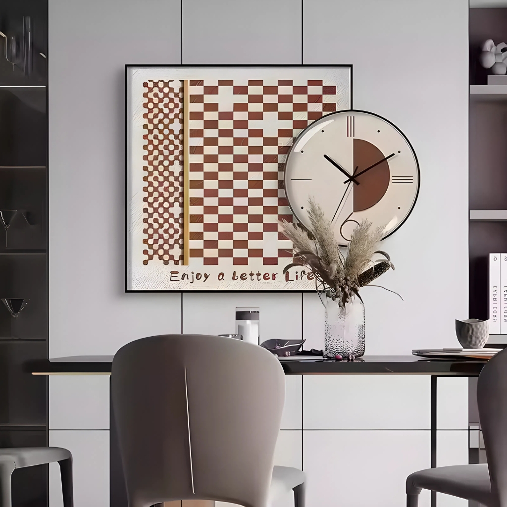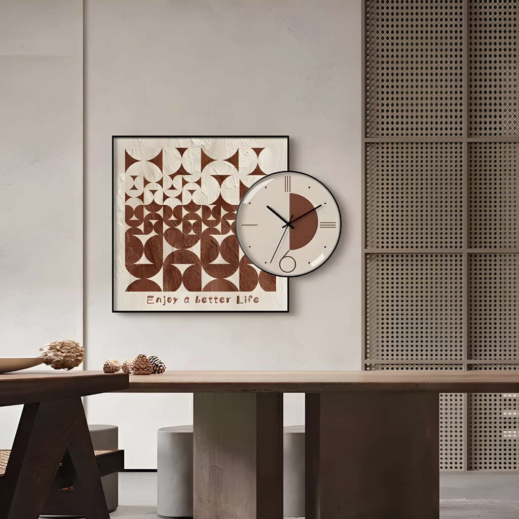 Dựa theo hình ảnh thực tế, sản phẩm sở hữu bức tranh trừu tượng tông nâu – trắng nổi bật, đi kèm đồng hồ mặt tròn tối giản đặt cạnh, tạo nên tổng thể mang tính nghệ thuật cao. Dòng chữ “Enjoy a better life” được in nhẹ nhàng bên dưới tranh, tạo cảm giác ấm áp và truyền cảm hứng cho không gian sống.